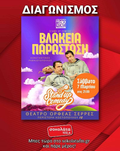 ΒΛΑΚΕΙΑ ΠΑΡΑΣΤΑΣΗ!!! Η πιο ξεκαρδιστική παράσταση του Κωνσταντίνου Ραβνιωτόπουλου, που είναι ένας από τους πιο έμπειρους και αναγνωρίσιμους κωμικούς της χώρας, ενώ αποτελεί το 5ο του solo , έρχεται για μια και μοναδική βραδιά στις Σέρρες στην αίθουσας Ορφέας.